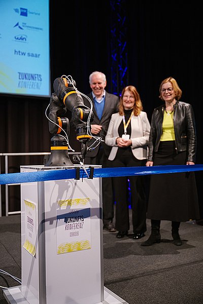 Das Programm stellte die zentrale Bedeutung des Faktors Mensch für die Schaffung von Innovationen heraus. Trotz Digitalisierung und KI wird das vielfältige Potenzial an Fachkräften in Zukunft immer wichtiger, um die anstehenden Herausforderungen im Kontext des demografischen Wandels, der Globalisierung, des Klimawandels und der Digitalisierung zu meistern. Dem Austausch von Wissen und Technologien zwischen Unternehmen und Hochschulen, aber auch zwischen der Gesellschaft und der Wissenschaft, kommt eine enorme Bedeutung für die Gestaltung der Transformation zu. Die Zukunftskonferenz setzte genau an dieser Schnittstelle an und bot einerseits spannede Impulse, die Gelegenheit zum Mitdiskutieren, aber auch die Möglichkeit, Forschung und Entwicklung an der HTW im Rahmen einer Projektausstellung hautnah zu erleben und mit Wissenschaftlerinnen und Wissenschaftlern unterschiedlicher Disziplinen in Austausch zu treten. Weiterhin konnte sich das Publikum ein Bild von dem geplanten neuen Zukunftslabor auf dem Schanzenberg Areal machen, das FITT und HTW ab 2027 eröffnen werden. Dort entstehen ab 2027 die idealen Rahmenbedingungen für das gemeinsame Arbeiten an Zukunftsthemen sowie auch die Möglichkeit der Ansiedlung von Ausgründungen.